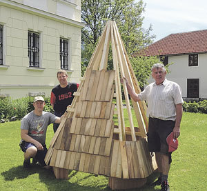 Gäste wie Einheimische können zur Zeit das Geschick der Zimmerleute in luftiger Höhe bestaunen, die den Kirchturm neu eindecken. Die Handwerker arbeiten ohne Gerüst. Auf den alten Balken sind sie dabei auf die Namen derer gestoßen, die 1838 den Turm errichtet und die 1926 das Dach von Blech auf Eternit gedeckt haben. Nun sind gehackte Lärchenschindeln an der Reihe. Als Ergänzung der bisherigen Konstruktion wird zwischen Turmkreuz und -dach eine Metallkugel angebracht. „Möge dieses Dach wieder für zwei Generationen halten“, hofft Pfarrer Hans Hammerl. Das verkleinerte Turmdach auf der Wiese soll motivieren für das Projekt zu spenden. Wer hundert Euro spendet, bekommt zu Erinnerung eine Holzschindel und dessen Name wird hoch oben am Turm verewigt.
