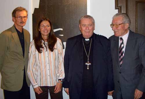Bischof Ludwig Schwarz (rechts) mit Extrembergsteigerin Gerlinde Kaltenbrunner und dem Künstler Herbert Friedl. Bis Ende November 2006 sind im Dominikanerhaus Steyr (Kirchenbeitragsstelle und Saal) Holzschnitte von Herbert Friedl zu sehen. Foto: dfk.