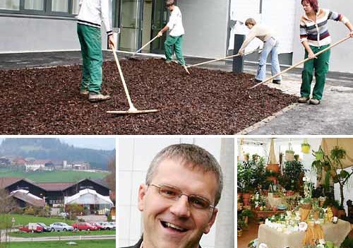 Altenfelden beherbergt ARTEGRA und Altenfeldner Werkstätten gGmbH (links unten). Werner Gahleitner (Mitte unten) ist Geschäftsführer von ARTEGRA. Die Gärtner/innen kümmern sich um Pflanzen und Gärten (oben). Fotos: KIZ, ARTEGRA (2)