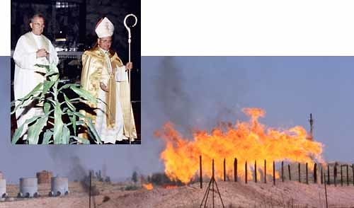 Auf den Erdölfeldern von Kirkuk. Das schwarze Gold hat in der Region Kirkuk einen beachtlichen Bauboom ausgelöst. Die Bewohner hoffen, dass mit der Wirtschaft auch ein stabiler Staat wächst. Zum Dank für alle Hilfe überreicht Erzbischof Louis Sako Prof. Hans Hollerweger (links oben) ein Brustkreuz. Fotos: Hollerweger (Erdölfeld) und ICO