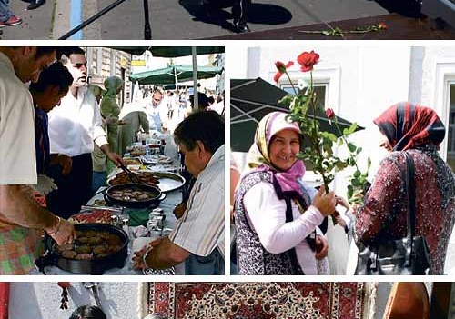 Die türkischen Trommler haben mit ihrem Schwung die Besucher/innen begeistert; Fleischlaibchen aus Schaffleisch, Rosen für die Besucher/innen, Gemütlichkeit mit Wasserpfeife – türkische Gastfreundschaft. Fotos: Ernst Gansinger