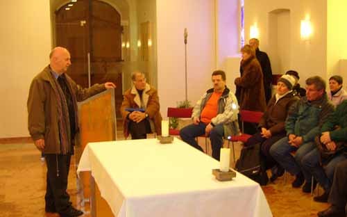 An die dreißig Teilnehmer/innen an der von Kunstreferat und KirchenZeitung veranstalteten „Kirchenroas“ besichtigten die Gotteshäuser von Hallstatt, Ebensee und Bad Ischl. Pfarrer Hans Hammerl (links) erläutert den Besuchern die Sakramentenkapelle von Bad Ischl, die Br. Thomas Hessler gestaltet hat.