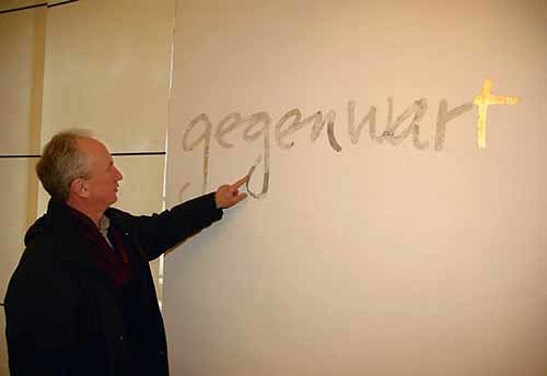 In die Tiefe gehen. Der Schriftzug „Gegenwart“ ist aus der weiß getünchten Wand herausgekratzt und zeigt die Färbelungen vieler vergangenener Generationen. Der letzte Buchstabe des Wortes ist vergoldet und erscheint dadurch als Kreuz.