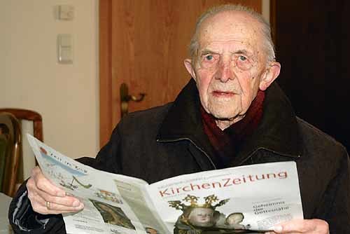 „Schau, es steht auch in der KirchenZeitung, dass man die Suppe ordentlich salzen muss“, sagt Karl Steinmair verschmitzt lächelnd zu seiner Tochter. Er zeigt dabei auf den Artikel, in dem von den Christen als dem Salz der Erde die Rede ist. Aus Gesundheitsgründen spart sie beim Kochen mit Salz, was dem Vater aber gar nicht behagt. Der Humor gehört zur Lebensphilosophie Karl Steinmairs. Jeden Sonntag geht er in den Gottesdienst und hat dabei Weltgeschichte miterlebt: „Ich erinnere mich noch gut, wie der Pfarrer von der Kanzel aus 1914 die Kriegserklärung vorgetragen hat.“ Im Blick auf ein Jahrhundert Kirchengeschichte ist für ihn klar: „In der Kirche ist es heute besser als früher. Denn die Priester schauen zu den Leuten.“