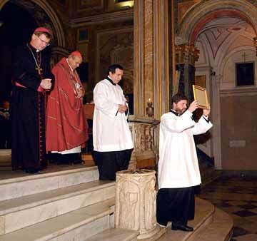 Alle österreichischen Bischöfe haben im Rahmen ihres Ad limina-Besuches in der römischen Kirche San Bartolomeo an einer Feier teilgenommen, während derer der Basisgemeinschaft Sant’Egidio ein Brief von Franz Jägerstätter übergeben wurde: Jägerstätter schrieb ihn wenige Tage vor seiner Hinrichtung aus dem Gefängnis an seine Frau. Die Kirche San Bartolomeo ist dem Andenken katholischer Märtyrer des 20. Jahrhunderts gewidmet. Bischof Manfred Scheuer (links) hat die Feier an der Seite von Kardinal Schönborn (2. von links) geleitet. „Ein Meilenstein in Sachen Jägerstätter“ bezeichnet Jägerstätter-Biografin Erna Putz den Gottesdienst in der übervollen Kirche: „Jägerstätter ist nun in besonderer Weise mit der Weltkirche verbunden.“