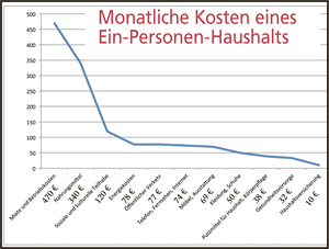 Von der Schuldnerberatung stammen die links in einer Grafik dargestellten Zahlen. Diese Fakten sollten berücksichtigt werden, wenn in Österreich über Mindestsicherung gesprochen wird. Nicht, dass die sich bei Addition ergebende Summe von 1.358 Euro im Monat ein absolutes Mindestmaß angibt, aber eine Orientierung ist sie, was eine Person braucht.