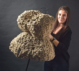Das gängige Schönheitsideal hinterfragt Laura Flach (1. Bild). Sie hat 248 Meter Seil zu einer Textilplastik verknotet und verbunden: „Dass die Figur dem Idealmaß nicht entspricht ist mir durchaus bewusst. Und trotz alldem bezeichne ich sie als schön“, sagt Laura Flach. Ihrer Meinung nach stellt die Figur eine lebenslustige und sich selbst bejahende Frau dar. Die Frage, ob alles eine Funktion haben muss oder bei einem Möbelstück auch die Ästhetik im Vordergrund steht, hat sich Katrin Reischl („Mädchen in Möbel“, 2. Bild) gestellt. Ihr Regalsystem erfüllt die Ansprüche verschiedener Möbel gleichzeitig. Es kann in mehrere Hocker oder in einen Beistelltisch umfunktioniert werden.
