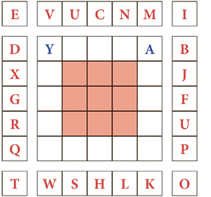 Im Raster ist das Alphabet von A bis Y (das Z fehlt) so einzutragen, dass jeder Buchstabe genau einmal vorkommt. Dabei sind folgende Regeln zu beachten: Die Buchstaben bilden von A bis Y eine Kette in der alphabetischen Reihenfolge. So steht zum Beispiel das E zwischen D und F (waagrecht, senkrecht oder diagonal). Die Kette kann die Richtung wechseln, darf aber niemals ein Feld überspringen. Die Buchstaben am Rand geben an, in welcher Zeile oder Spalte oder Diagonale der betreffende Buchstabe platziert ist. So bedeutet das I oben rechts, dass das I irgendwo in der Diagonale nach links unten einzutragen ist. Das F rechts am Rand fordert auf, F in dieser Zeile zu platzieren. Und das V oben gibt die Anweisung, in dieser Spalte das V einzutragen.