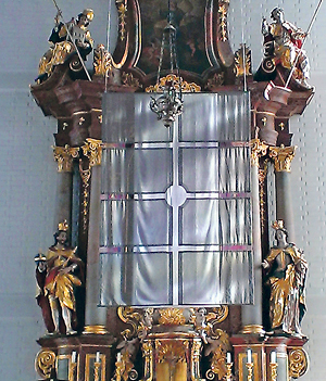 Verhüllt wird der Altar in zwei Ebenen. Über ein weißes Tuch sind zwei graue Stoffbahnen gespannt, die horizontal unterbrochen, jedoch durch violette Nähte zusammmengehalten werden. Durch das dahinterliegende weiße Tuch werden vertikale Linien und eine horizontale Linie sichtbar. Hinter dem kreisrunden Ausschnitt in der Mitte befindet sich am Altarbild die Darstellung des Jesus-Kindes. Das Fastentuch verbindet so das „Kind in der Krippe“ mit dem Tod und der Auferstehung Jesu.
