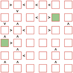 Die Zahlen 1 bis 6 sind in jeder Zeile und in jeder Spalte so einzutragen, dass in jeder Zeile und Spalte jede Zahl genau einmal vorkommt. Es gelten folgende Bedingungen: Die Zeichen zwischen den Zahlenkästchen bedeuten, dass die Zahl auf der offenen Seite des Zeichens größer als die Zahl beim Spitz des Zeichens sein muss. Zum Beispiel 6 > 5 oder 2 < 4 ... Die grün gefärbten Kästchen bedeuten, dass hier eine ungerade Zahl stehen muss.