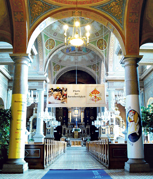 Direkt beim Haupteingang wurde die Pforte der Barmherzigkeit eingerichtet: unter anderem mit einem Transparent und dem Logo des Jahres der Barmherzigkeit (rechts). Ein blauer Teppich mit der Aufschrift „barmherzig“ weist den Weg durch die Pforte. Auf der Innenseite des Transparentes befindet sich das Ordensmotto der Redemptoristen: „Bei IHM ist Erlösung in Fülle“, passend zum Jahr der Barmherzigkeit, und das Bild der Mutter von der immerwährenden Hilfe, der die Kirche geweiht ist. Papst Franziskus habe die Heilige Pforte im Petersdom nach innen hin geöffnet, machte Bischofsvikar Vieböck in seiner Predigt aufmerksam. Das heißt für ihn: „Barmherzigkeit soll also nicht bloß aus der Kirche heraus, sondern in die Kirche hinein kommen.“