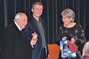 Passend zum Ton seiner Ansprache und dem Klima des Abends: Die Welser Dekanatsassistentin Birgit Raffelsberger bedankte sich bei Bischof Maximilian Aichern mit einem Paar handgestrickter Socken für seine „herzerwärmende“ Rede vor den Pfarrgemeinderäten des Dekanates.