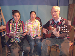 Linz. Der Jesuit P. Werner Hebeisen ist weit und breit als herausragender Musiker bekannt. Kürzlich besuchten ihn zwei Novizinnen der Sionsschwestern, die auf dem Heimweg von ihrem Praktikum in Polen nach Jerusalem waren. Er machte Victoria Nabil aus Ägypten (links) und Alejandra Vásquez aus Guatemala mit den Grundbegriffen der Musik und einfachen Liedern vertraut. Um die ersten Hemmungen seiner Schülerinnen zu überwinden, eröffnete er den Workshop mit Jodler und „Juchuzzer“. Dann sangen sie einfache englischsprachige geistliche Lieder. P. Hebeisen war im Sommer bereits im Noviziat der Sionsschwestern in Jerusalem zu Gast, um mit den jungen Schwestern Gesänge einzuüben, die sie in ihrer pastoralen Arbeit einmal einsetzen können. Noviziatsleiterin ist Sr. Juliana Baldinger aus Meggenhofen.