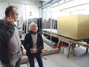 Das Edelmetall wird sich in den neuen künstlerisch gestalteten Orten im Altarbereich wiederfinden: Altar, Ambo, Priestersitz. Die Idee dazu kam von Inge Dick. Die international erfolgreiche Künstlerin konnte für die Gestaltung gewonnen werden. Sie sah sich die Kirche an und machte einen Entwurf, er trägt den Titel „Lichtung“. Dieser wird nun Schritt für Schritt umgesetzt. Im Atelier des Steinmetzes, der für die Dauer der Arbeiten eine große Halle zur Verfügung stellt, warten Inge Dick und Hilde Maier schon auf den Besuch. Genau 13.471 Goldblättchen in unendlich vielen Nuancierungen werden seit Wochen von der Vergoldemeisterin Hilde Maier in stundenlanger Kleinarbeit aufgetragen. Die beiden Frauen arbeiten hier seit Juni täglich bis zu zehn Stunden. „Das Gold kommt mit der Post“, erzählt Maier und schmunzelt. In der Hand hält sie eine kleine Schachtel mit Goldblättchen. „Die Goldblättchen sind ganz unterschiedlich. So wie das Leben auch“, meint die Künstlerin. Inge Dick schätzt diese Arbeit sehr: „Es ist sehr kontemplativ. Ich sitze davor und habe das Gefühl, es strahlt von innen her. Man ist glücklich dabei“, erzählt sie. Das Unsichtbare sichtbar machen, dem eine Gestalt zu geben, ist schon immer ein Motor ihrer künstlerischen Arbeit gewesen. Das Arbeiten mit Gold kommt jetzt für die 76-jährige Künstlerin neu dazu. Der Einsatz von Gold sorgte teilweise für Kritik in der Pfarre. Ist Gold nicht zu prunkvoll? Inge Dick und Christian Öhler sagen darauf: „Gold steht für das Göttliche. Es macht die Fenster auf für eine andere Dimension.“ Zahlreiche Kirchen oder Tempel im Ausland leuchten in Gold. Die goldenen Flächen durchbrechen das Irdische, Erdige. Verwendet wird für die Kirche in Bad Ischl recyceltes Gold. Aufgetragen werden die Blättchen auf Eschenholz, einem sterbenden Baum. Und was die Kosten betrifft? Dazu meint Inge Dick: „Stein wäre viel teurer gewesen.“