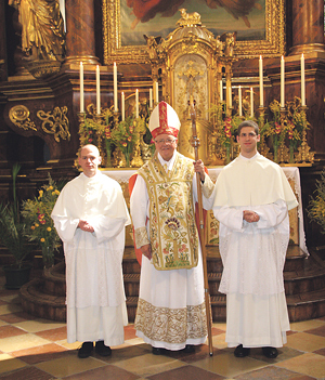 Am 28. August, dem Hochfest des Hl. Augustinus, von dem die Ordensregel der Prämonstratenser stammt, legten im Pontifikalamt, das H. Abt Martin Felhofer in der vollen Schlägler Stiftskirche feierte, fr. Jeremia Mayr die Ewige Profess (mit H. Professgöd Rupert Frieberger) und fr. Vitus Glira die Zeitliche Profess (auf drei Jahre) ab. Fr. Jeremia hat Fachtheologie, Religionspädagogik und Französisch (Lehramt) studiert und absolviert derzeit als Assistent das Doktoratsstudium (Neues Testament) an der Universität Graz. Mit fr. Vitus, der nun sein Noviziat beendet hat, an der KTU Linz Fachtheologie und Religionspädagogik studiert und ab Herbst 2015 ein Jahr Theologie an der Uni Tübingen studieren wird, hat der Schlägler Konvent derzeit 40 Mitbrüder. H. Abt Martin dankte den zwei Professen für ihren bewusst gesetzten weiteren Schritt in die Gemeinschaft der Mitbrüder und sprach in seiner Predigt mit Bezug auf den Propheten Jeremia (1. Lesung) von dessen Bitte um „Umkehr zu Gott“ und von geistlichen „Wegweisern“, die dorthin leiten und allen ans Herz gelegt sind. Im Anschluss an den Festgottesdienst waren alle Mitfeiernden zur Agape und zur Begegnung in den Stiftshof geladen.
