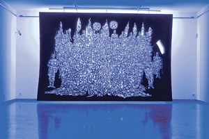 Eines der bevorzugten Motive von Thomas Riess sind Raumanzüge, die als Barriere zwischen dem verletzlichen und vergänglichen Individuum und „dem feindlichen Raum“ wirken. Auf großen schwarzen Leinwänden entstehen die schemenhaften Abbilder dieser Anzüge durch Striche mit einem Korrekturbandroller. So setzt auch er sich mit dem sich durch die Ausstellung ziehenden Thema der Vergänglichkeit und Auflösung des menschlichen Lebens auseinander.
