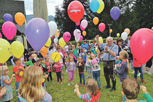 Leider hatte auch der Regen von dieser Einladung gehört und stellte sich immer wieder mit kräftigen Schauern ein. Doch die Pfarrgemeinde ließ sich nicht entmutigen und feierte ein herzliches Fest. Die Kicker beim Fußballwettkampf „Pfarre am Ball“ waren ohnedies wetterfest, die Spielstationen für Kleinkinder wurden kurzerhand in den Kirchenraum verlegt und machten so die Bruder-Klaus-Kirche zu einem richtigen Ort der Begegnung. Den Schlusspunkt bildete bei Sonnenschein ein bunter Luftballonstart!