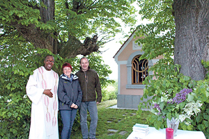 Einladung zu Stille und Gebet Mitterkirchen. Im Rahmen einer Maiandacht weihte der Pfarrprovisor der Pfarre Mitterkirchen, Chigozie Neebedum (links), die Trautmann-Kapelle in der Ortschaft Lehen ein. Die alte, im Jahre 1825 erbaute Kapelle war schon so baufällig, dass sich die Besitzer Helmut und Elisabeth Eichinger (im Bild) entschlossen, eine neue zu errichten. Bereits vor zwei Jahren gingen sie mit Unterstützung einer Firmgruppe ans Werk, die Weihe war nun der Abschluss aller Arbeiten. Das Kleindenkmal steht zwischen zwei alten Linden und lädt den Vorübergehenden zur Betrachtung und zum Gebet ein.