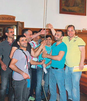 Sieben Minuten lang läuteten am 8. Mai afghanische und syrische Männer, die derzeit im Kapuzinerkloster in Braunau wohnen, die Glocken in der Kapuzinerkirche. Anlass war das Gedenken an das Ende des Zweiten Weltkrieges und die Befreiung vom Nationalsozialismus vor 70 Jahren. „Männer, die selbst aus Kriegsregionen kommen – wahrscheinlich auch Christen und Muslime – läuten zusammen für den Frieden“, berichtet Sr. Katharina Franz von den Franziskanerinnen, berührt von diesem Ereignis. Sie hatte der Flüchtlingshelferin im Kapuzinerkloster die Einladung an alle Pfarren und Klöster in OÖ weitergeleitet, sich am Glockenläuten zu beteiligen.