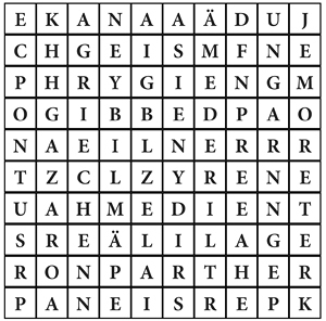 Das Pfingstereignis wird im zweiten Kapitel der Apostelgeschichte erzählt. Ein „Who’s who“ der Völker rund um Israel tummelt sich im Bericht. Als die Fremden die Apostel von Gottes Taten reden hörten und verstehen konnten, waren die einen ratlos, die anderen spotteten und meinten, weil sie verstehen, müssten die Redner betrunken sein. Da sind die Ratlosen leichter zu verstehen als die Rat Wissenden. Machen Sie mit. Im Raster rechts ist in gewisser Weise ein betrunkenes Durcheinander entstanden. Viele Namen aus der Apostelgeschichte 2,1–13 sind darin untergebracht (von links nach rechts, rechts nach links, oben nach unten oder unten nach oben eingetragen). Ein paar Namen haben sich aber auch hineingeschmuggelt. Diese sollten Sie finden und uns Ihre Fundliste bis 29. Mai 2015 schicken.