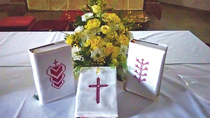 Oftering. Die Pfarre dankt den Frauen der neu gegründeten „Kreativrunde“, die für die neuen Gotteslob-Liederbücher 150 Leineneinbände angefertigt und mit „Ebenseer Kreuzstich“ bestickt haben. Die Initiative dazu ergriff Irmgard Dobetsberger. „Jetzt ist unser Gotteslob noch etwas kostbarer geworden“, freuen sich viele Kirchenbesucher/innen. Stroheim. Das neue Pfarrzentrum in Stroheim nimmt schon Formen an. Möglich ist dies auch durch tatkräftige Unterstützung vieler ehrenamtlicher Helfer/innen und durch Geldspenden. Alexandra Kloimstein vom Katholischen Bildungswerk Stroheim übergab Pfarrassistent Albert Scalet eine Spende über 1.000 Euro für den Bau. Die feierliche Eröffnung und Segnung des Hauses ist für 18. Oktober 2015 geplant.