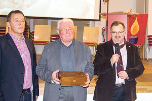 Regau. 23 Bilder, die Künstler für die Gestaltung von Adventfenstern gestiftet hatten, wurden kürzlich versteigert. Die Moderatoren Christian Dausek und Dieter Leicht konnten Pfarrer Franz Hörtenhuber (Mitte) mehr als 2.800 Euro als Spende für das Pfarrheim übergeben.