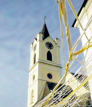 Für den Kirchenraum hat die Künstlerin Lucia Haas als anschauliches Zeichen ein würfelförmiges Objekt entworfen, in das ein Netz gespannt ist. Und vor der Kirche hat sie mit Kindern aus gelben und weißen Streifen ein Netz geknüpft, das ein Jahr lang für die Vorbeikommenden nicht zu übersehen war. Pfarrer Ferdinand Reisinger erläutert: „Es wurde uns zum Zeichen, wie bunt unsere Begegnungen sein können. Wer unter dem Netz durchging und eine Beengung spürte, konnte auch an den Psalm 124 denken, in dem es heißt: „Das Netz ist zerrissen und wir sind frei.“ Zur Erinnerung an das Netz als Jahresbegleiter hat Pfarrer Reisinger einen Kalender gestaltet. Er hat die Skulptur vor der Kirche zu unterschiedlichen Jahreszeiten, aus verschiedenen Perspektiven und bei unterschiedlicher Witterung fotografiert.