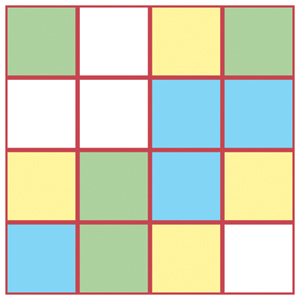 In den Raster rechts sind die Zahlen von 1 bis 16 nach folgenden Regeln einzutragen: 1. Die geraden Zahlen sind in der ersten und dritten Zeile, die ungeraden in der zweiten und vierten. 2. Die Spaltensumme ist immer 34. 3. Die Summe der ersten wie auch der dritten Zeile ist 36, die Summe der zweiten sowie der vierten Zeile ist 32. 4. Die Summe der Felder in der Diagonale von links unten nach rechts oben ist 16. 5. Die Summe der Zahlen in den blauen Feldern beträgt 11, die Summe der Zahlen in den gelben Feldern beträgt 57 und in den grünen Feldern ist die Summe 25. 6. Die Zahlen 8 und 9 befinden sich in Eckfeldern, die genau diagonal gegenüberliegen.