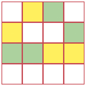 In den Raster rechts sind die Zahlen von 1 bis 16 nach folgenden Regeln einzutragen: 1. Die Zeilensumme ist immer 34, die Summe in den beiden Außenspalten ist 32, in den Inenspalten 36. 2. In den beiden Außen-Spalten befinden sich nur ungerade Zahlen; in den beiden inneren Spalten nur gerade Zahlen. 3. Die Summe der Zahlen in den grünen Feldern beträgt 10, die Summe der Zahlen in den gelben Feldern beträgt 58. 4. Die Zahl 15 steht direkt über der Zahl 3, die Zahl 2 steht direkt rechts von der Zahl 16. 5. Die Differenz der zwei mittleren Zahlen in der zweiten Reihe ist 6, die Differenz der zwei mittleren Zahlen in der untersten Reihe 2. 6. Die Zahlen im linken unteren und rechten oberen Eckfeld sind jeweils kleiner als die Zahlen in den beiden anderen Eckfeldern.