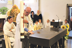 Nur 16 Monate nach dem verheerenden Hochwasser von 2013 feierte die Pfarre die Neugestaltung des Kirchen-Innenraumes. Die damalige Katastrophe war auch der Grund, warum die Kirche nicht nur neu ausgemalt, sondern „von Grund auf“ vom Künstler Roman Pfeffer neugestaltet worden ist. Am markantesten: der auf vielen Beinen stehende Altar, gefertigt aus Mooreiche. Rund 3000 Jahre war diese Eiche in einem Moor gelegen. Insgesamt 19 Firmen – alle aus der Region – waren an der Neugestaltung – von Fußboden, Heizung bis zur neuen Beleuchtungsanlage beteiligt. Erst im Juni war mit dem Umbau begonnen worden. Pfarrer Josef Pesendorfer brachte am Ende des Festgottesdienstes seine Dankbarkeit zum Ausdruck. Goldwörth sei von einer versorgten Gemeinde zu einer für sich selbst sorgenden Gemeinde geworden. „Die Bevölkerung hat sich entschieden, nicht nur etwas wieder aufzubauen, sondern etwas Neues zu schaffen“, brachte auch Landesrat Michael Strugl seine Anerkennung für die Neugestaltung zum Ausdruck. Während viele Bewohner der Donaugemeinde ihre Häuser nach dem Hochwasser wieder hergerichtet haben, stehen andere erst vor der Entscheidung, ob sie hierbleiben oder absiedeln werden. Und Propst Holzinger: „Der Altar ist Sinnbild für alles, was uns im Leben untergeht und davonschwimmt.“ Das Weihefest in Goldwörth wurde zusammen mit dem Erntedankfest gefeiert – mit einer voll geschmückten Erntekrone. Im Vorjahr war ein Bogen der Krone ungeschmückt geblieben – in Erinnerung an die Schäden durch das Wasser.