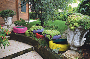 Da hat jemand in einem oberitalienischen Villendörfchen nicht weit vom See eine unerwartete Idee. Alte Reifen, kunterbunt, schief aufeinander stapeln, begrünen, bepflanzen und als Gartendekoration benützen. Eine ganz spezielle persönliche Gestaltung. Wir waren im Vorüberspazieren ganz hingerissen. Mit einem Garten vergleicht die Kirchenlehrerin Teresa von Ávila in ihrer Gebetslehre die Seele – die Schrift heißt „Vida“, das bedeutet „Leben“. Es gibt verschiedene Arten der Bewässerung für den Seelengarten. Das Spektrum reicht vom angestrengten, asketischen Beten bis zum „Regen“ Gottes, bei dem ich nichts mehr tun muss. Außer, alles zu lassen. Reines, vollkommenes Nichts-Tun, Nichts-Wollen. Letztens, eine Übungssituation für mich: Nein, die Hüttenwanderung wolle er nicht machen. Er fände es witzig, einfach mal im Garten zu lungern. Für den Fall, dass ich doch nicht auf „Gammelmodus“ umschalten könne, könne ich ja mein Hamsterrad mitbringen und darin laufen, während wir uns unterhielten. Nichts-Tun lernen, im Außen, im Innen. Seelenfreuden können sein: Einsamkeit und Stille, Erinnerung an eine tagelange Wüstenwanderung oder eine unglaubliche (Motorrad-)Reise, Nähe eines geliebten Menschen, ein Besinnungstext im Herzen wiederholt, Meditation am Morgen, der Durchbruch auf der Kletterroute. Wenn mein Leben momenthaft vom Glück überschwemmt wird. Der eigene, persönliche Garten, ohne mein Zutun durch und durch getränkt und erfrischt.