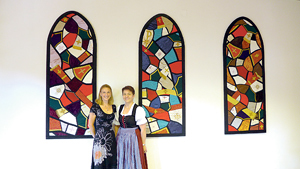 Die Künstlerin Simona Standler und Renate Hametner (im Bild rechts) haben vier Wandteppiche in Form von Kirchenfenstern angefertigt. Angeregt durch Glasfenster von Margret Bilger haben die beiden Wartbergerinnen Reste von liturgischen Stoffen wie Ministrantenkleider, Kelchtücher, Manipel und Stolen zusammengestellt und vernäht. Pfarrassistent Franz Küllinger würdigte die textilen Arbeiten in der Sonntagspredigt: „In diesen Kirchenfenstern ist die Buntheit des Zuspruches Gottes versammelt.“