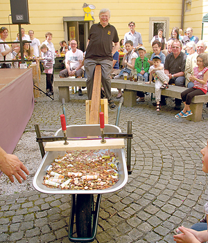Freistadt. Im Rahmen des Pfarrfestes wurde Pfarrer Franz Mayrhofer mit Geld aufgewogen. Bei 3.901,14 Euro neigte sich die Scheibtruhe mit Geld zu Boden und hob den Pfarrer in die Höhe. Der Betrag dient der Renovierung des Pfarrhofs (die KiZ berichtete).