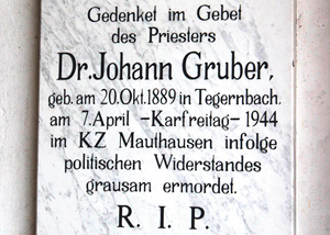1989 ließ er eine Gedenktafel (Detail) für den 1944 ermordeten Priester errichten, der aus der Pfarre Grieskirchen stammt. Dies ist das erste öffentliche Denkmal für den Priester-Martyrer.