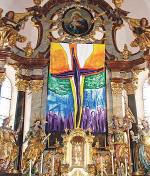 Neukirchens Pfarrer Jan Plata hat Hobbykünstlerin Elisabeth Ratzenböck gebeten, ein neues Fastentuch (Bild rechts) für die Kirche zu malen. Entstanden ist ein Kunstwerk, das stark mit Farbensymbolik arbeitet. So steht beispielsweise Blau in dem Bild für: „die Seele frei machen für den Atem Gottes“, wie Elisabeth Ratzenböck sagt. Weiß sei Erlösung, Friede, Freude und tiefe Dankbarkeit.