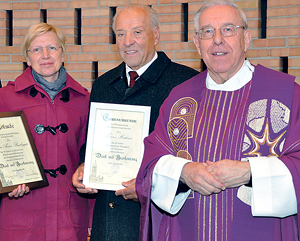 Kirchham. Pfarrer P. Burkhard Berger (rechts) bedankte sich mit einer Ehrenurkunde und einem sehr persönlich verfassten Gedicht bei Religionslehrerin Maria Anna Buchegger (links), die seit 20 Jahren an der Volksschule unterrichtet und die Kinder auf die Erstkommunion vorbereitet. Ebenso dankte P. Burkhard Franz Hutterer (Mitte), Vorbeter bei Prozessionen, beim Anbetungstag und bei Nachtwachen, für 25 Jahre unermüdlichen Dienst in der Dorfgemeinschaft.