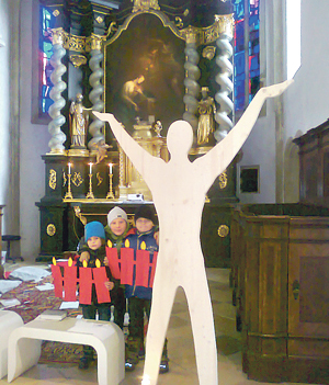In Mauthausen wurde am ersten Adventsonntag das neue Gotteslob aufmerksamer durchgeblättert als in vielen anderen Pfarren, enthält doch das Gesangbuch ein Lied, das ein Mauthausener verfasst hat: Chorleiter Alfred Hochedlinger. Die Melodie von Nummer 775 „Geheimnis des Glaubens“ stammt von ihm. Hochedlinger führte die Gottesdienstbesucher/innen in das neue Gotteslob ein und probte für die Messfeier gleich einige neue Lieder. „O Herr, wir warten auf dich“ (Nr. 233) wurde dann gemeinsam gesungen. Es passte zur Gestaltung der Jugendlichen, die ihre Erwartungen als Bitten zu Gott trugen. Die erhobenen Arme einer Figur aus Holz, die im Altarraum aufgestellt war, symbolisierten die Offenheit Gott gegenüber. Im Anschluss an den Gottesdienst waren alle eingeladen, im Pfarrheim Bilder der Kinder aus Mauthausen zum Thema „Moderne Kirche“ zu besichtigen und zu bewerten. Neben Zeichnungen hatten Hauptschüler auch Texte zur Frage verfasst: Was wäre, wenn es die Kirche nicht mehr gäbe? Die Ausstellung wurde im Rahmen eines Kreativwettbewerbes zum 400-Jahr-Jubiläum der Pfarre Mauthausen organisiert. Im Jahr 1613 wurde aus der Seelsorgestelle Mauthausen, die unter der Verantwortung der Pfarre Ried in der Riedmark stand, eine eigenständige Pfarre.