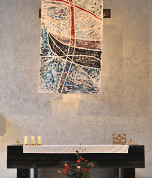 Das Bild auf weißem Baumwollstoff bezieht sich in seinen Farben Rot, Blau und Schwarz auf den Kirchenraum und vor allem auf das große Glasfenster von Alfred Stifter an der linken Altarseite.