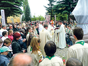 Stadtpfarre Linz / Ditró. „Vorne zwei Fahnenträger, dann der gesamte Pfarrgemeinderat, schließlich eine Kutsche mit Pfarrer Laszló Barótí und dem Nationaldirektor der österreichischen katholischen Fremdsprachigen Seelsorge, Dr. Laszlo Vencser, der in Ditró, Rumänien, geboren wurde.“