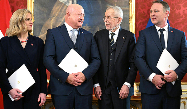 Zum Bild: Beate Meinl-Reisinger (Äußeres, NEOS), Christian Stocker (Bundeskanzler, ÖVP), Bundespräsident Alexander Van der Bellen und Andreas Babler (Vizekanzler, Wohnen, Kunst, Kultur, Medien und Sport, SPÖ) am Montag, 3. März, im Rahmen der Angelobung der neuen Bundesregierung.