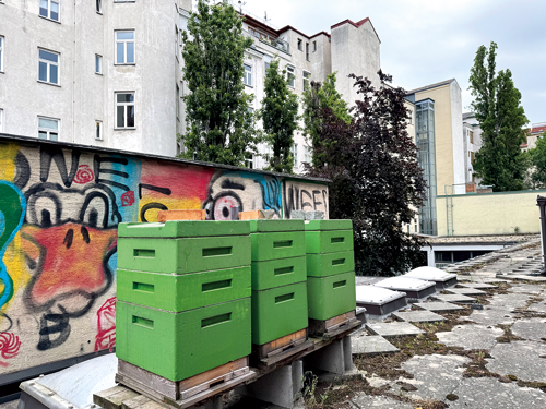 uf dem niedrigeren Dach des Pfarrheims, das an die Kirche angebaut ist, findet sich eine Überraschung: Drei Bienenvölker leben an diesem Ort, der auf den ersten Blick nicht an Öko-Romantik denken lässt. Doch Innenhof-Bäume, Sträucher in Parks und Balkonpflanzen der umliegenden Wohnhäuser bieten den Honigbienen ausreichend Mischkost. Auch darüber hat sich das Umweltteam Gedanken gemacht und im Pfarrblatt einen Artikel über bienenfreundliche Balkonbepflanzung veröffentlicht.