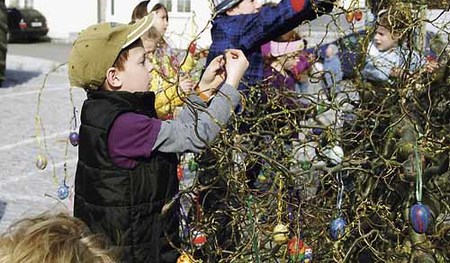 Meggenhofener Ministrant/innen stellen Ostereierbaum auf