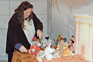 Es ist eine pfiffige Idee der City-Pastoral: Passant/innen können auf der Linzer Landstraße ­biblische Erzählungen mit Stofffiguren nachstellen.