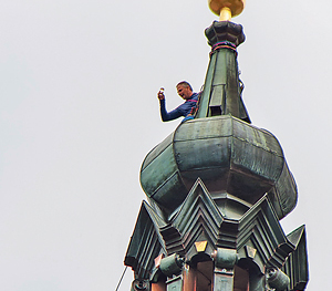 Der Kirchturmdecker stieß in luftiger Höhe mit einem Glas Sekt auf das neue Turmkreuz an.