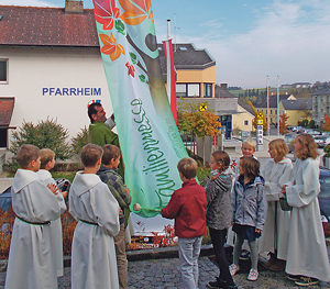 Ab sofort bewirbt die Pfarre St. Martin im Mühlkreis mittels Fahne ihre Familiengottesdienste.