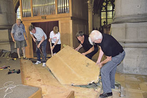 Der Fronleichnamsgottesdienst war die letzte Messfeier im Mariendom in Linz, tags darauf kamen in der Früh Helferinnen und Helfer der Dompfarre und packten beim Abbau des Holzpodiums vor dem Altar kräftig an.