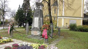 Der Obelisk vor der Pfarrkirche in Kleinmünchen erinnert an die Gefallenen des Ersten Weltkriegs, die in diesem Stadtteil von Linz beheimatet waren.