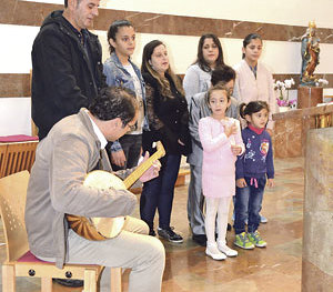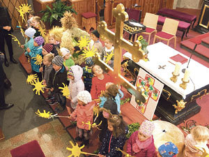 Der Festgottesdienst zur Steckung des Turmkreuzes wurde von den Kindergartenkindern musikalisch eröffnet. Die Schulkinder durften das Kreuz hochziehen.