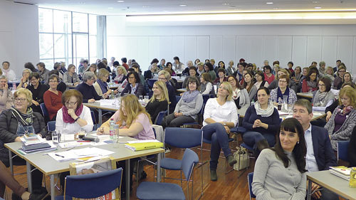 „90 Prozent der negativen Situationen, die wir uns vorstellen, treten gar nicht ein“, erklärte Gisela Trobisch. Die Burnout-Prophylaxe-Trainerin und Kabarettistin gab den 152 Pfarrsekretärinnen – darunter drei Männer – Tipps, wie sie mit Stress und Druck in ihrem beruflichen und persönlichen Umfeld umgehen können. Am Morgen mit einem Ritual zu beginnen, mit fünf Minuten Gebet etwa, ist ein wichtiger Einstieg in den Tag, so Trobisch: „Beim Gebet gibt man die Verantwortung in die Hände eines Größeren und das befreit.“ Zur geistigen Beweglichkeit soll auch die körperliche kommen, macht die Trainerin aufmerksam. Denn Muskelstärke bedeutet mentale Stärke. Trobisch lud ihre Zuhörerinnen ein, bewusst die Dankbarkeit zu pflegen: Jeder Mensch hat Grund, dankbar zu sein – für die Natur, die Freiheit, für das Vergeben können oder für seine Familie. Druck und Belastung erleben Menschen sehr unterschiedlich. „Darum ist es wichtig, niemals den Stress von anderen Personen zu bewerten“, betont Trobisch.