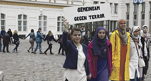 Zahlreiche Vertreter von Jugendorganisationen haben vergangene Woche als Zeichen gegen den Terror eine Menschenkette um die Wiener Minoritenkirche gebildet.